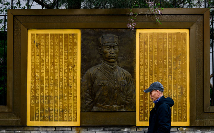 在北京市西城区赵登禹路,市民从赵登禹将军英雄事迹主题浮雕前走过(3月26日摄)。新华社记者 刘金海 摄